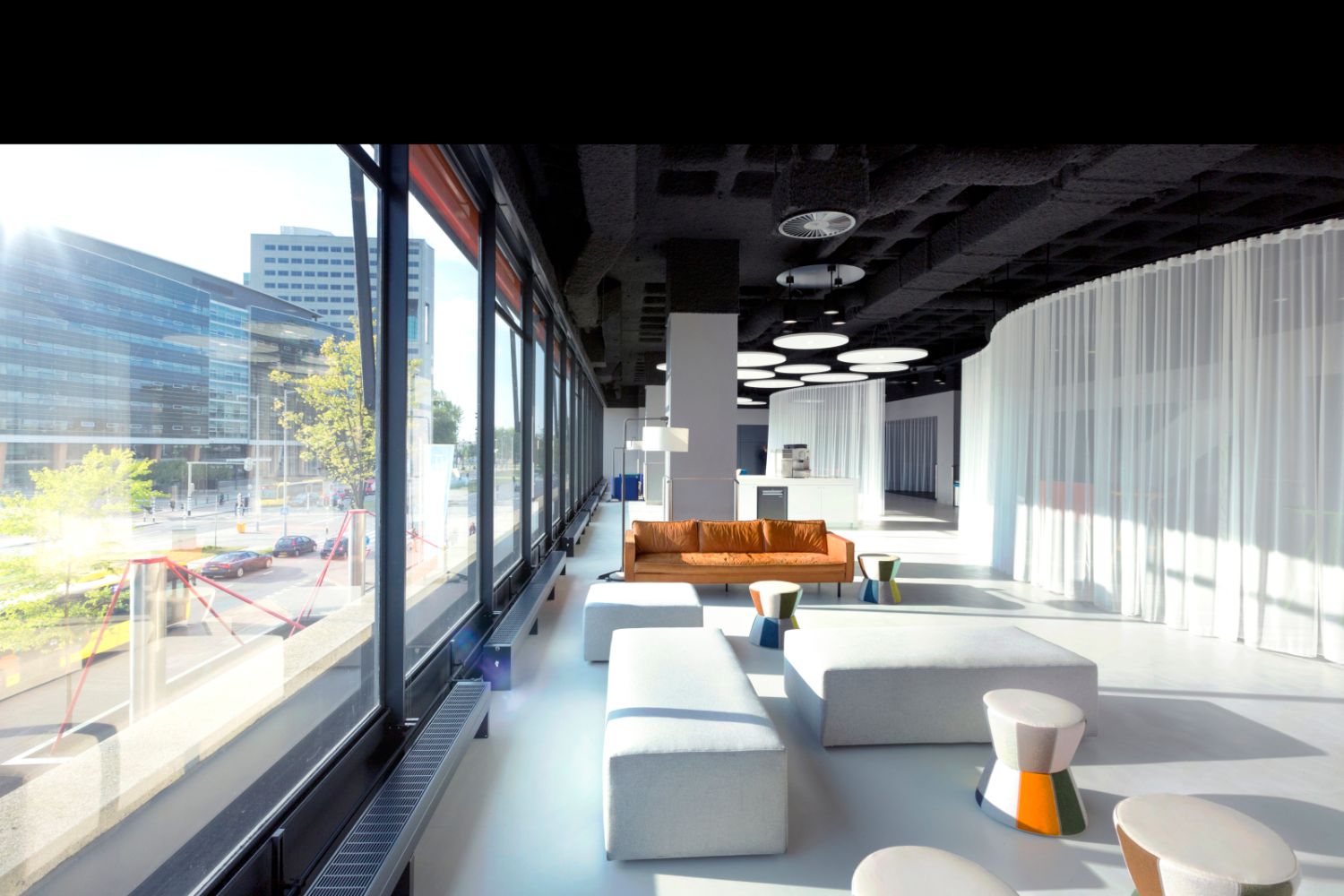 The wall also consist of a water supply wardrobe and paper , but also switches, locks and gadgets like a rotating clock, that appears in special circumstances. The hollow space is multi functional as it isolates sound, hides heavy columns and can be used for various purposes.The central square, the MeetUp Plaza, offers a cozy atmosphere for meetings of every type.There are various, colored niches that offer a nice meeting point for everyone. A 87-meter lang curtain divides gently the area into smaller ones. In this way, also more confidential or private gatherings can take place.